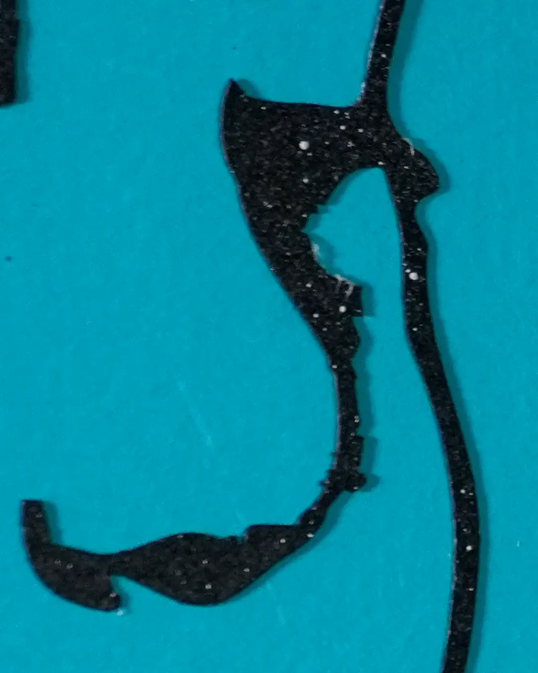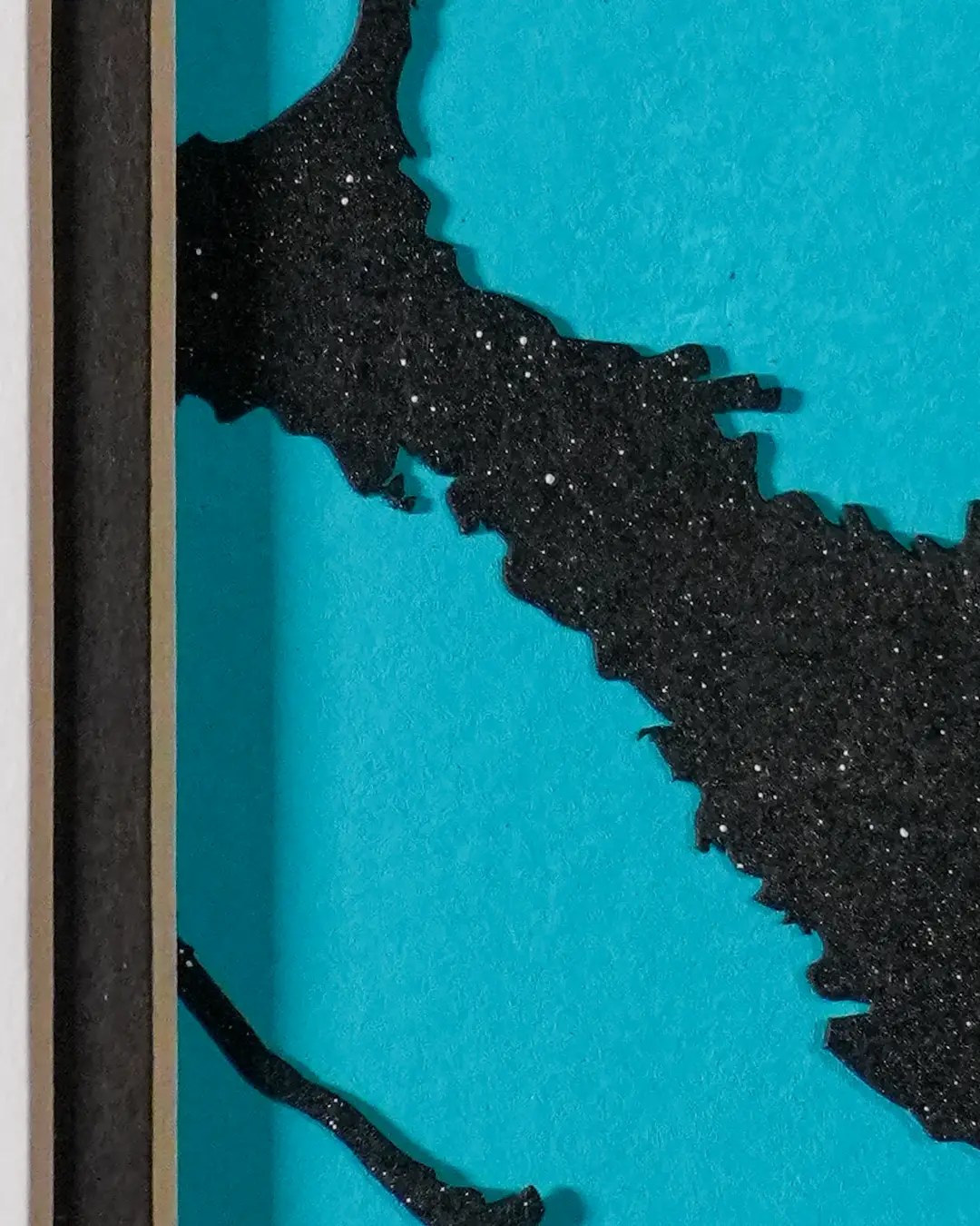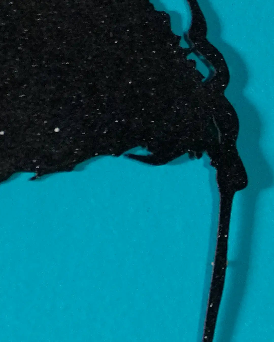 This version brings the spirit of that piece into a smaller format. The figure is laser-cut from paper, spray-painted black with white flecks of paint splattered for texture and set against a hand-painted teal background. Each one is finished by hand, so no two are exactly alike.