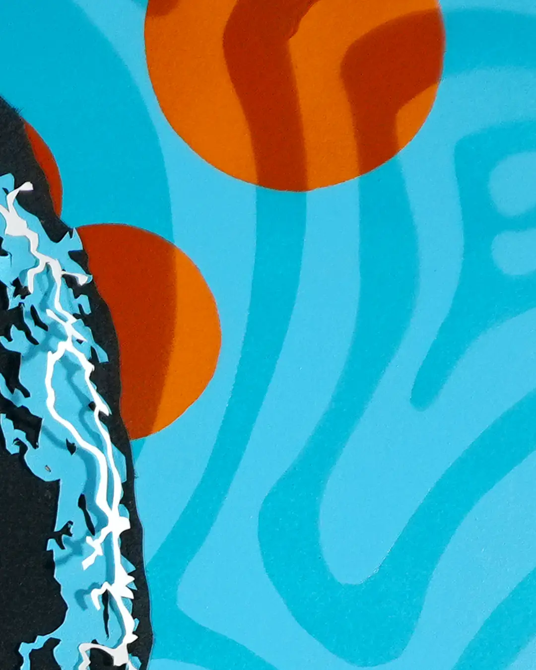 This print is made from a photograph of my original hand-cut paper piece — Jimi Hendrix mid-performance, built from four stacked layers of acid-free hand-cut paper. The three foreground layers are each single connected sheets, where every cut stays connected to hold the piece together. The wavy background is a nod to the Jimi Hendrix Experience album cover, with my own take on it. Up close in the print you can see exactly where the layers meet and the depth between them.