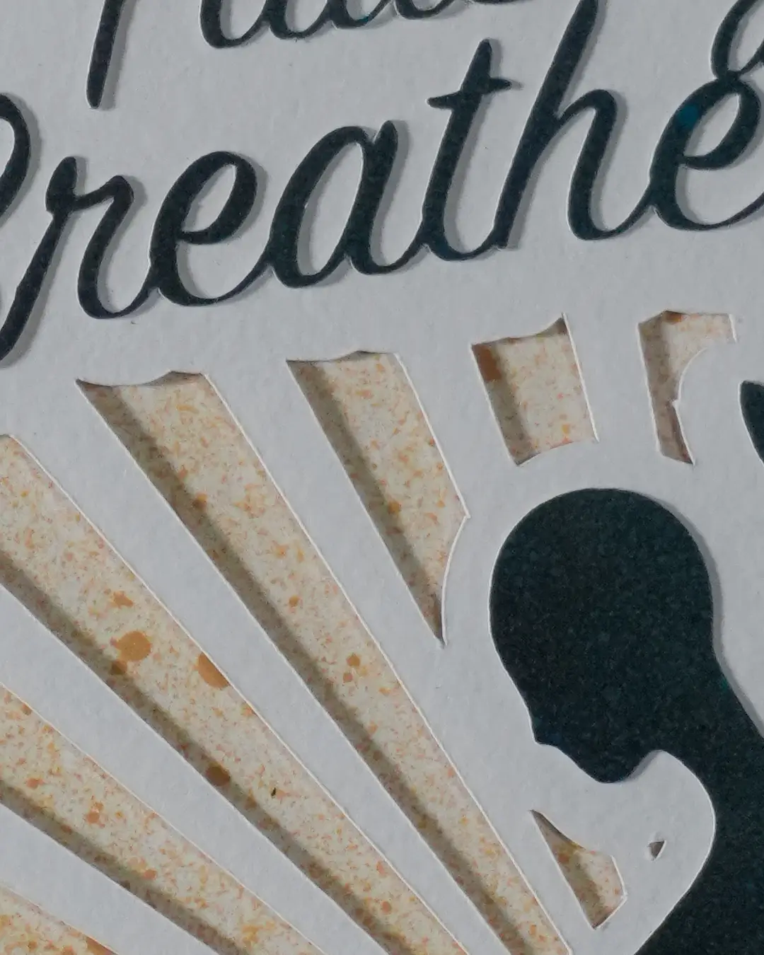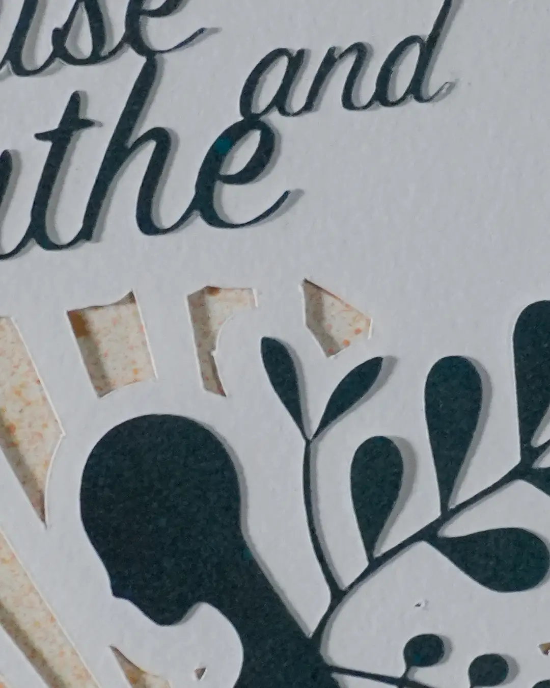 A seated figure surrounded by botanical shapes — leaves, branches, berries — with sun rays opening up behind her. The words "Pause and Breathe" are cut in script across the top. It's built from three layers of paper: a deep teal foreground with the figure and text, a white middle layer, and warm gold-speckled paper in the back showing through the cuts. The layering gives it a quiet depth that changes depending on how the light hits it.