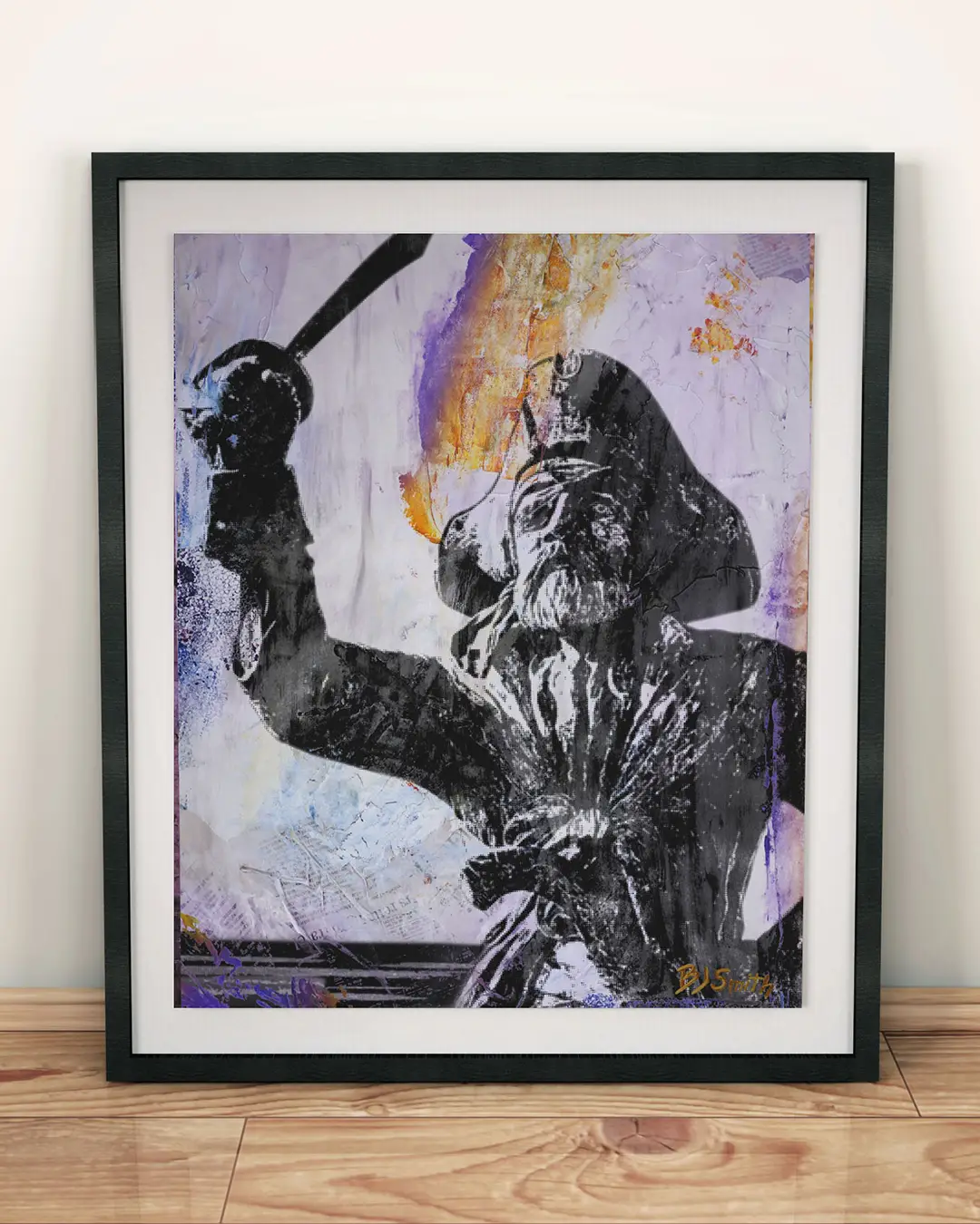 ECU's Pirate statue outside of Dowdy-Ficklen Stadium. The background is pale lavender with a big burst of gold paint behind the sword. Up close you can see torn newspaper and book pages showing through the background, with purple paint at the base and text fragments in the layers.