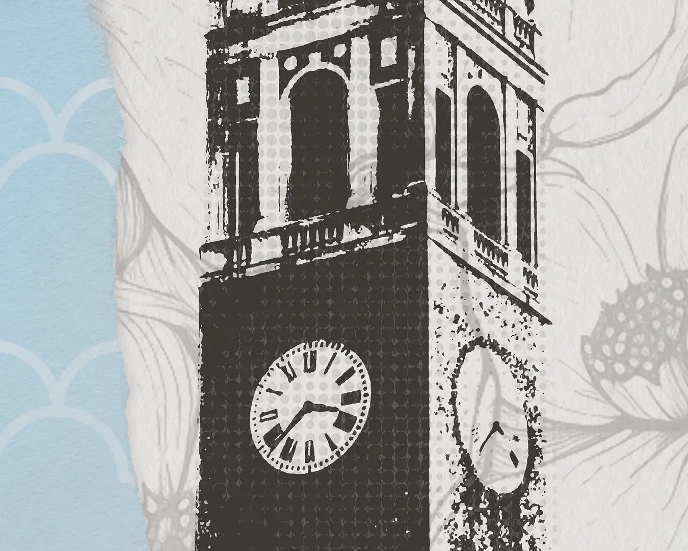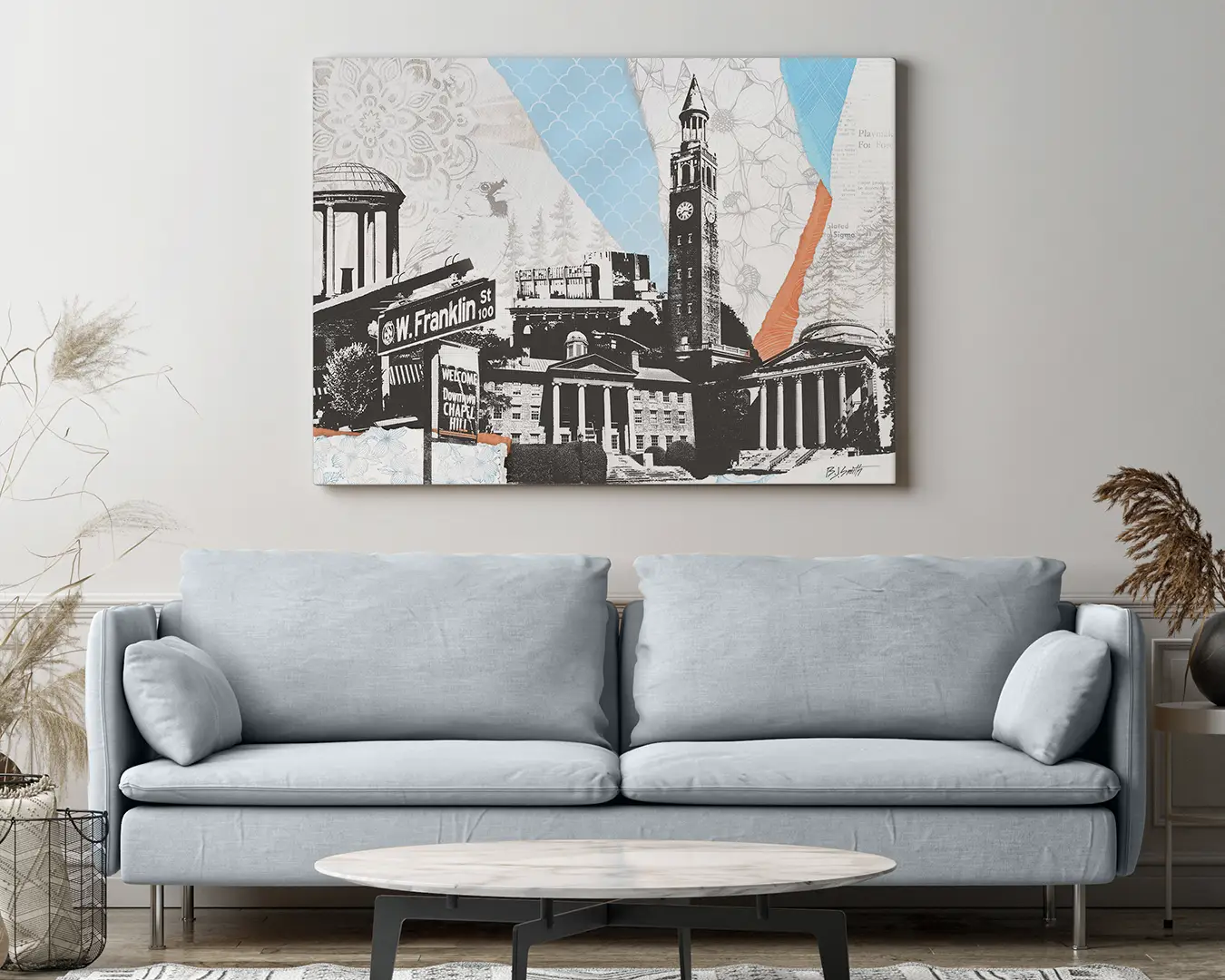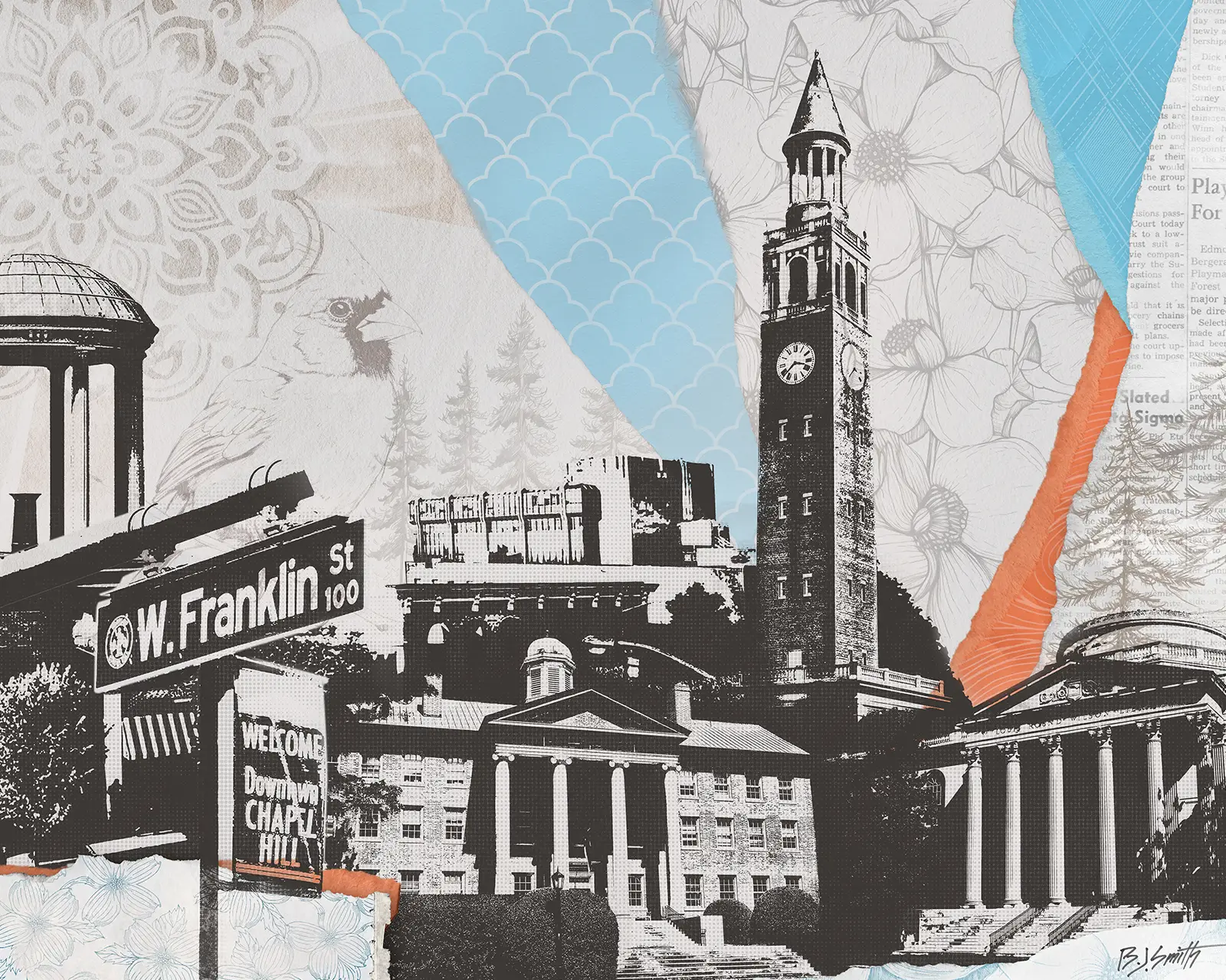 Franklin Street, the Old Well, the clock tower, Morehead Planetarium — all the spots that make Chapel Hill what it is, layered into one piece. The landmarks are built up from halftone imagery over torn paper, botanical patterns, and pops of Carolina blue and orange. There are some North Carolina nods worked in too — dogwood blossoms, a cardinal, longleaf pines. If you spent any time in Chapel Hill, you'll spot something in here that takes you right back.