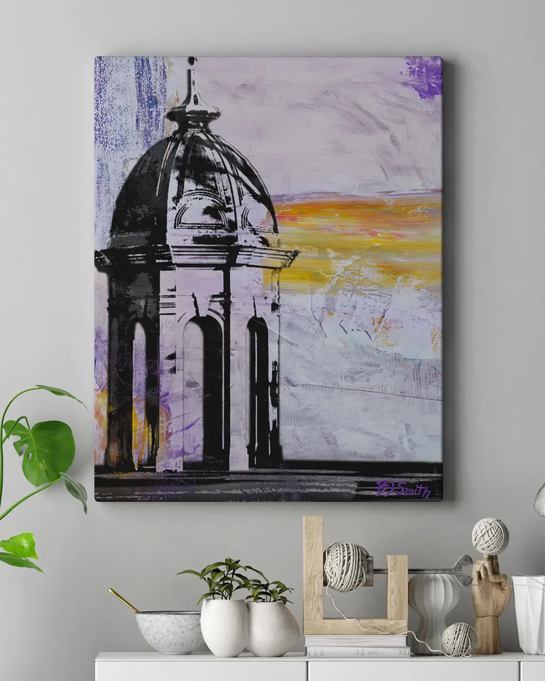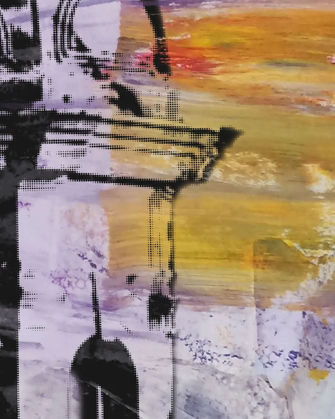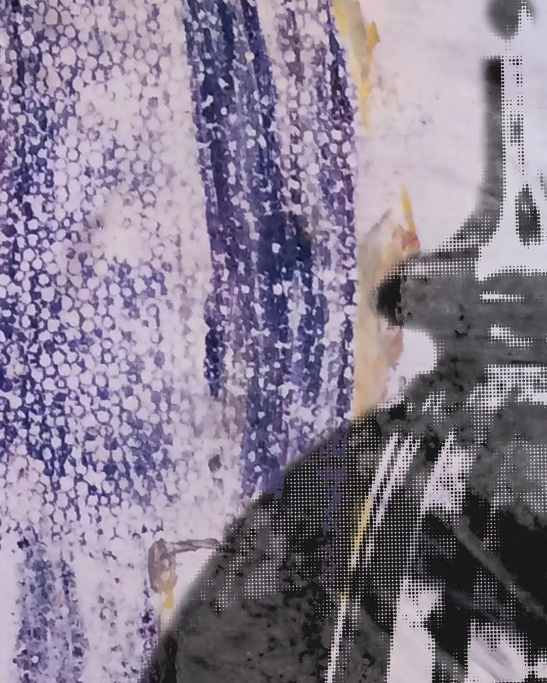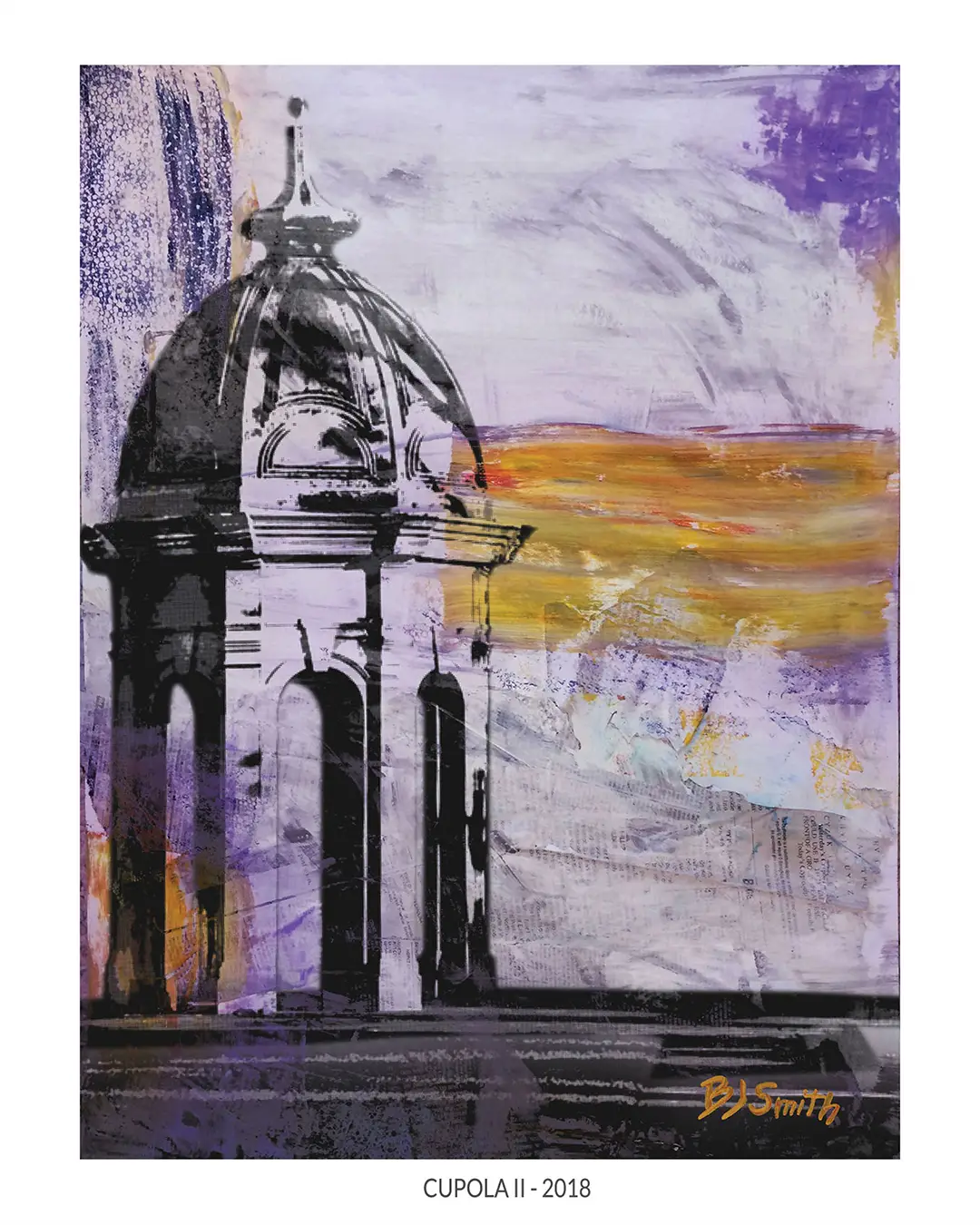 The cupola is probably the most recognizable thing on ECU's campus, other than Dowdy-Ficklen Stadium. The structure is built up from halftone dots over spray paint, bits of newspaper, and loose washes of purple and gold. It looks right from across the room, but there's a lot going on in that background when you get close to it. This piece is special to me since the cupola was placed while I was a student there.