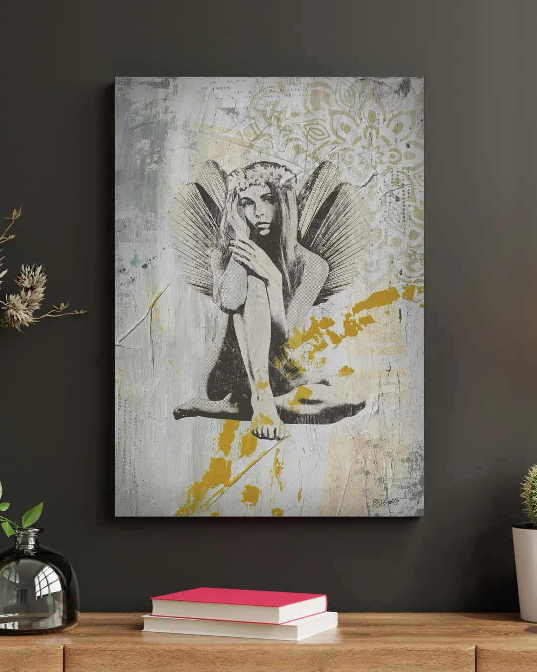 This one is a seated angel with wings out and a flower crown, looking down with her hands near her face. I worked it in halftone black and white and kept the background in soft sage and grey tones. Up in the upper right there's a large mandala stencil pattern in olive gold, and there are splashes of mustard yellow in the lower portion. A lot going on in that background if you get close to it.