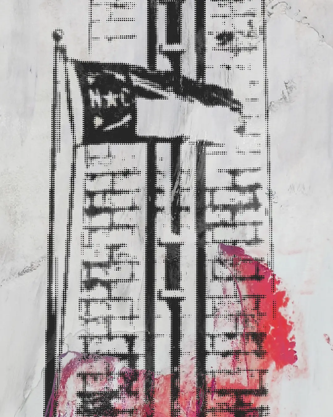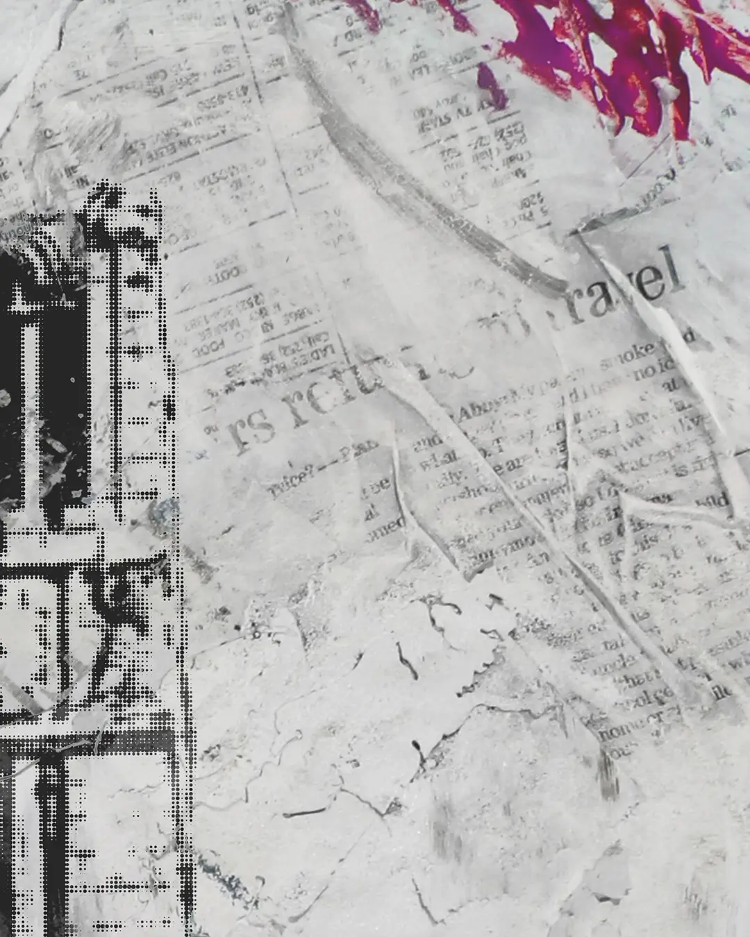 NC State's Memorial Belltower, flag and all, rising up out of the tree line. The tower is built from halftone dots over a background of torn newspaper, washes of pale gray, and hits of red that bleed up from the base. Up close you can see crumpled paper, cracking paint, and layers of newsprint showing through underneath.