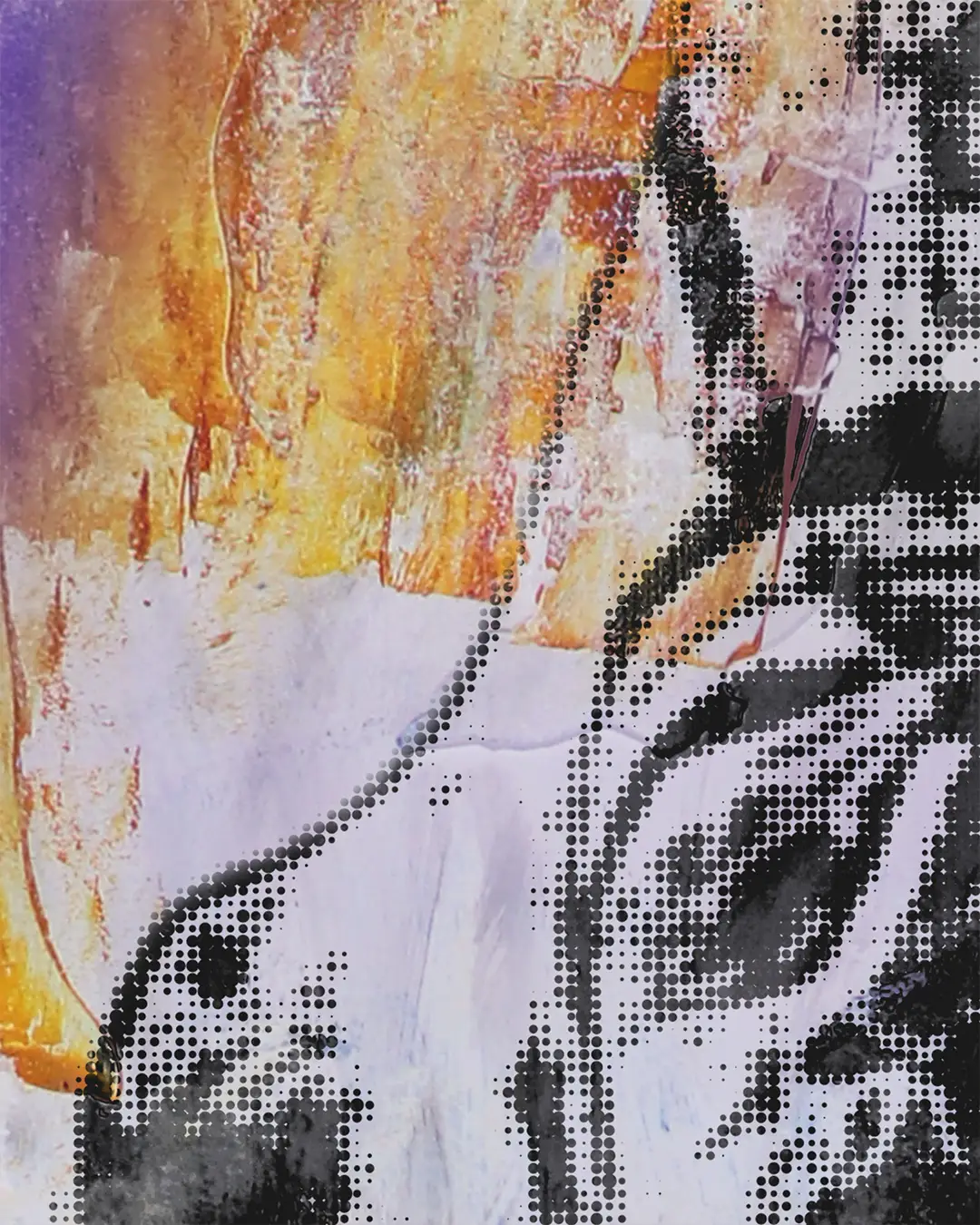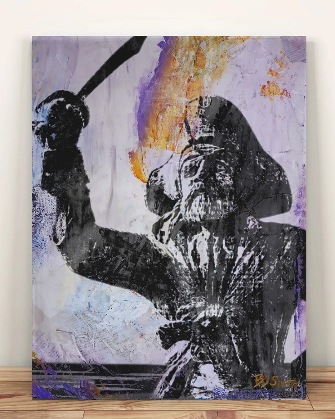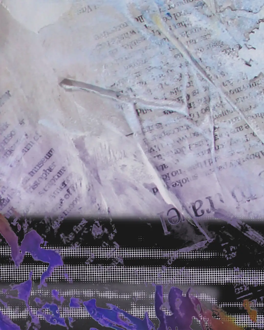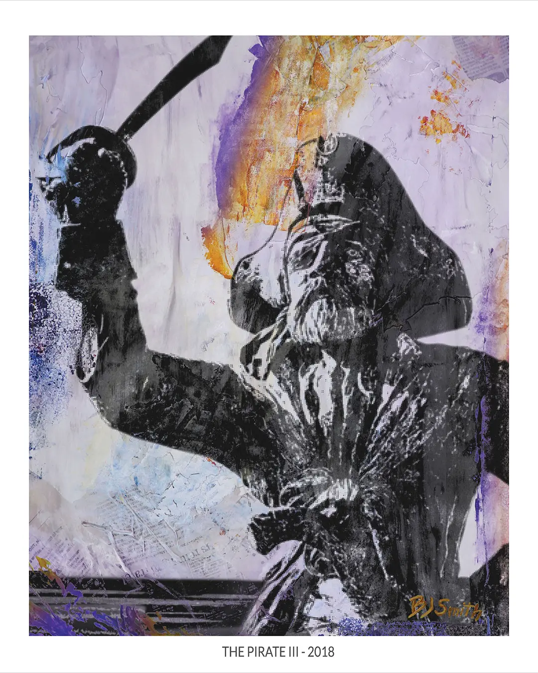 ECU's Pirate statue outside of Dowdy-Ficklen Stadium. The background is pale lavender with a big burst of gold paint behind the sword. Up close you can see torn newspaper and book pages showing through the background, with purple paint at the base and text fragments in the layers.